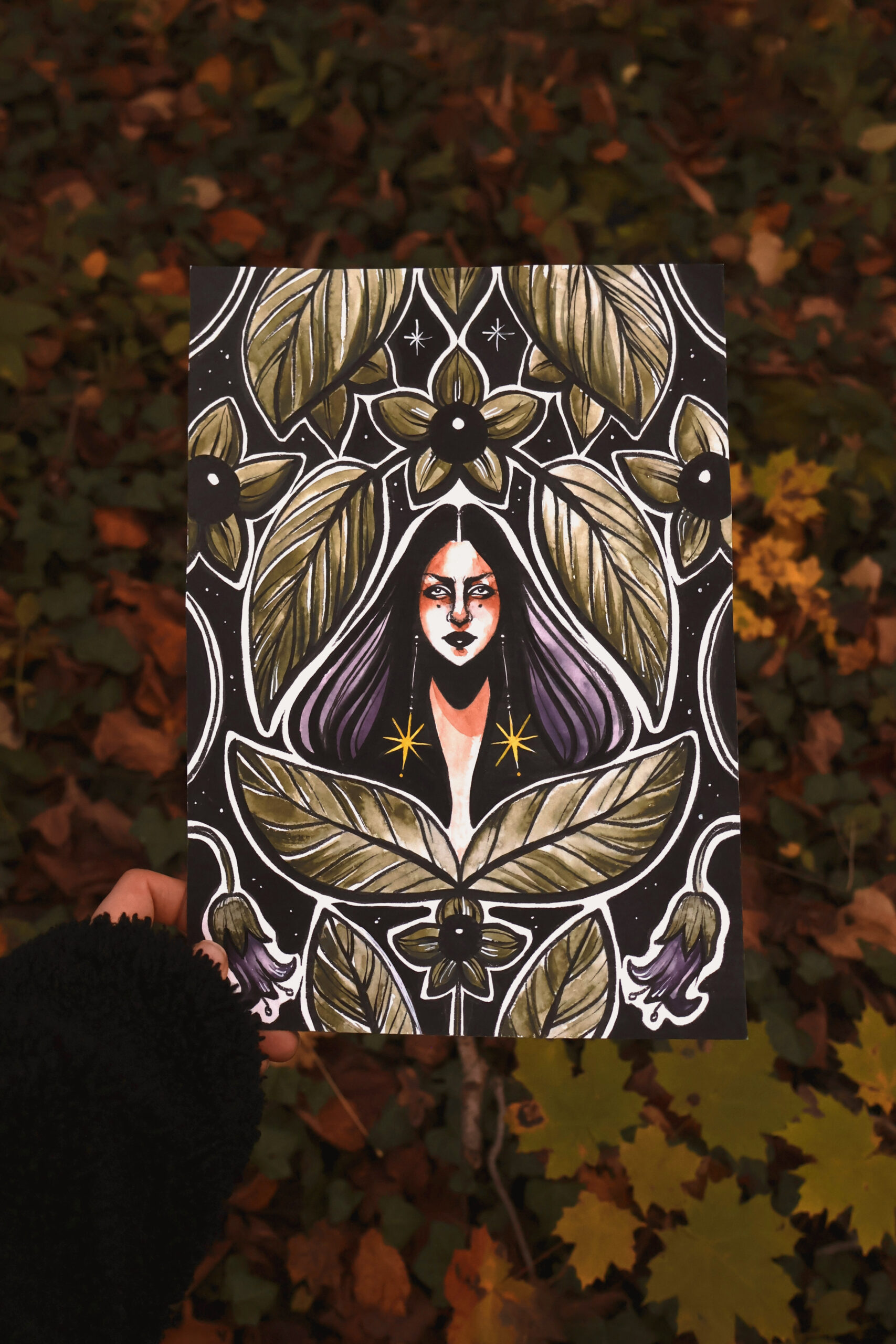 Plongez dans la magie des sorcières avec “Bella donna”. Elle est réalisée en l’honneur de cette plante, éminemment mystique et royale.
