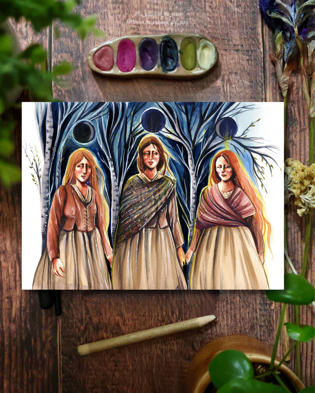 Entrez dans la magie des sorcières avec ces fileuses issues d’un temps immémoriel. Ici, elles viennent par trois, comme les trois Parques originelles. Cette illustration est parfaite sur un autel aux cycles lunaires, à une déesse de la Lune ou bien encore aux ancêtres.