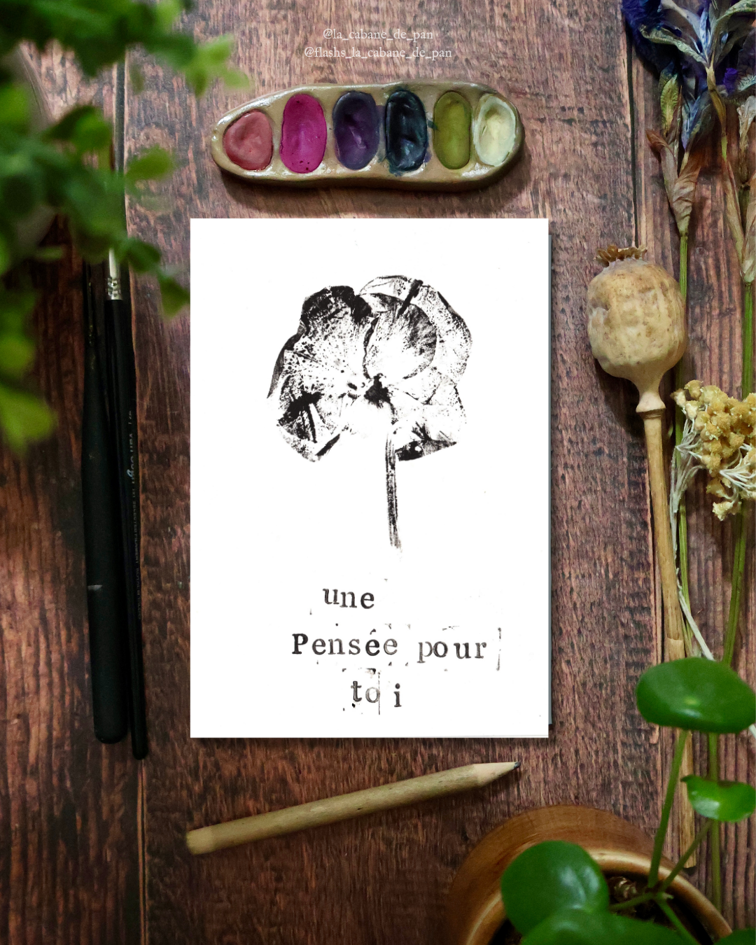 Entrez dans la magie empreintes botaniques avec cette subtile carte, réalisée avec une empreinte de pensée commune.